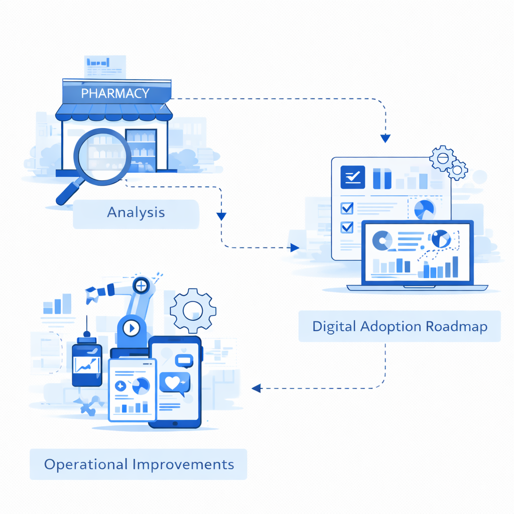 DiNova worked with a community pharmacy to identify opportunities for digital transformation that improve operational efficiency and customer engagement. Through a detailed business and technology analysis, we developed a digital adoption roadmap focused on automation, analytics, and improved service delivery.